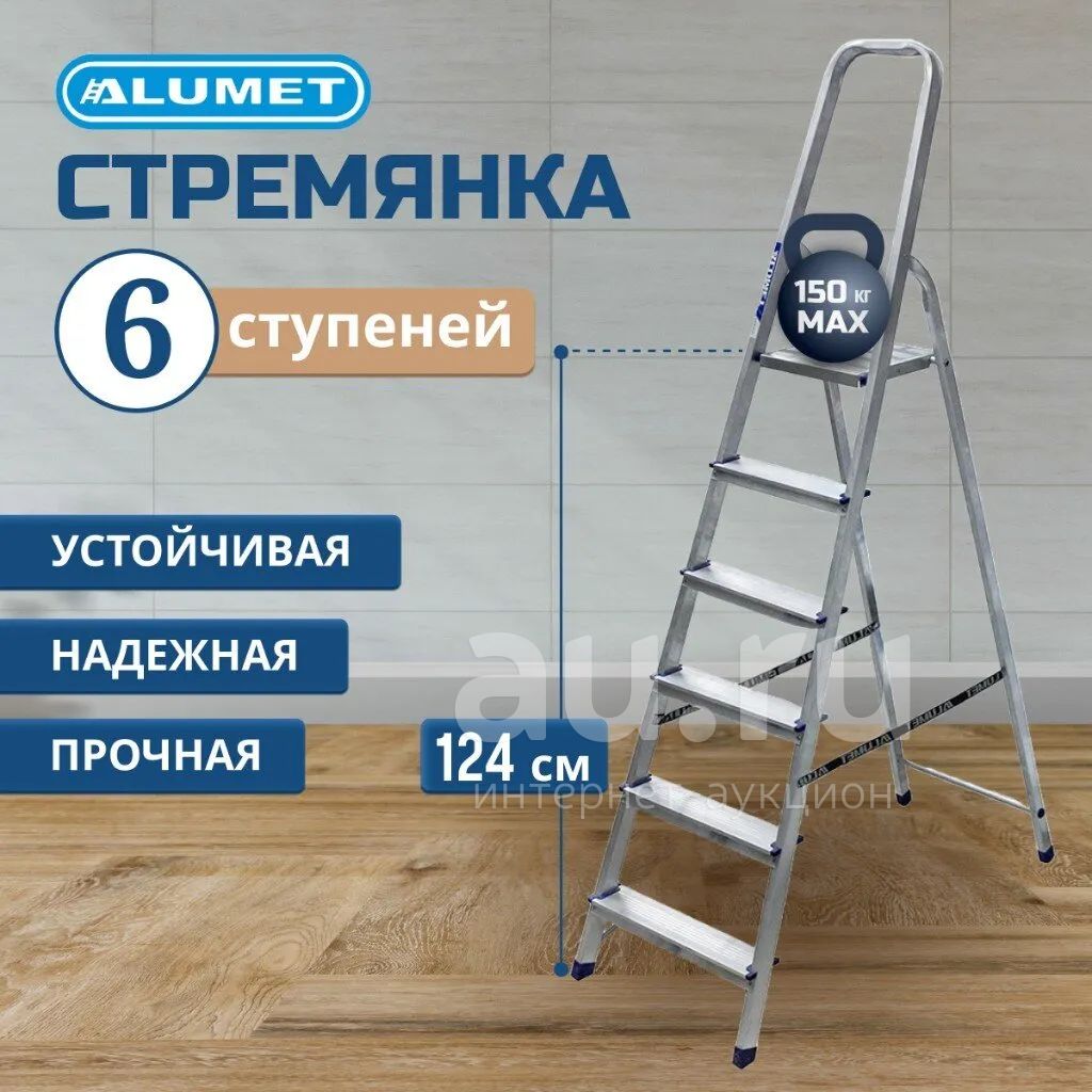 Стремянка 1 секция, 6 ступеней, алюминий, 1.24 м, 150 кг, рифленые ступени, Alumet, AM706