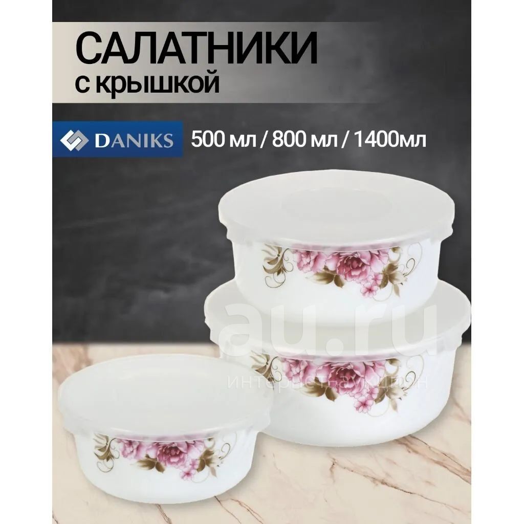 Салатники стеклокерамика Daniks Анжелика: набор из 3 круглых мисок с крышками (0.5, 0.8, 1.4 л) в подарочной упаковке — идеальное решение для сервировки и хранения дома и на даче.