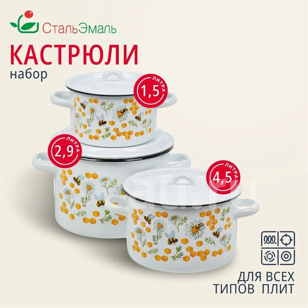 Набор посуды эмалированная сталь, 3 предмета, кастрюли 1.5, 2.9, 4.5 л, индукция, СтальЭмаль, Пчелы, 1с33