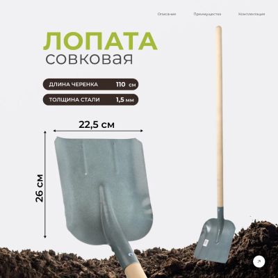 Совковая лопата имеет прямоугольную форму рабочей части. Данная модель дополнительно усилена ребрами жесткости для увеличения прочности и срока службы.