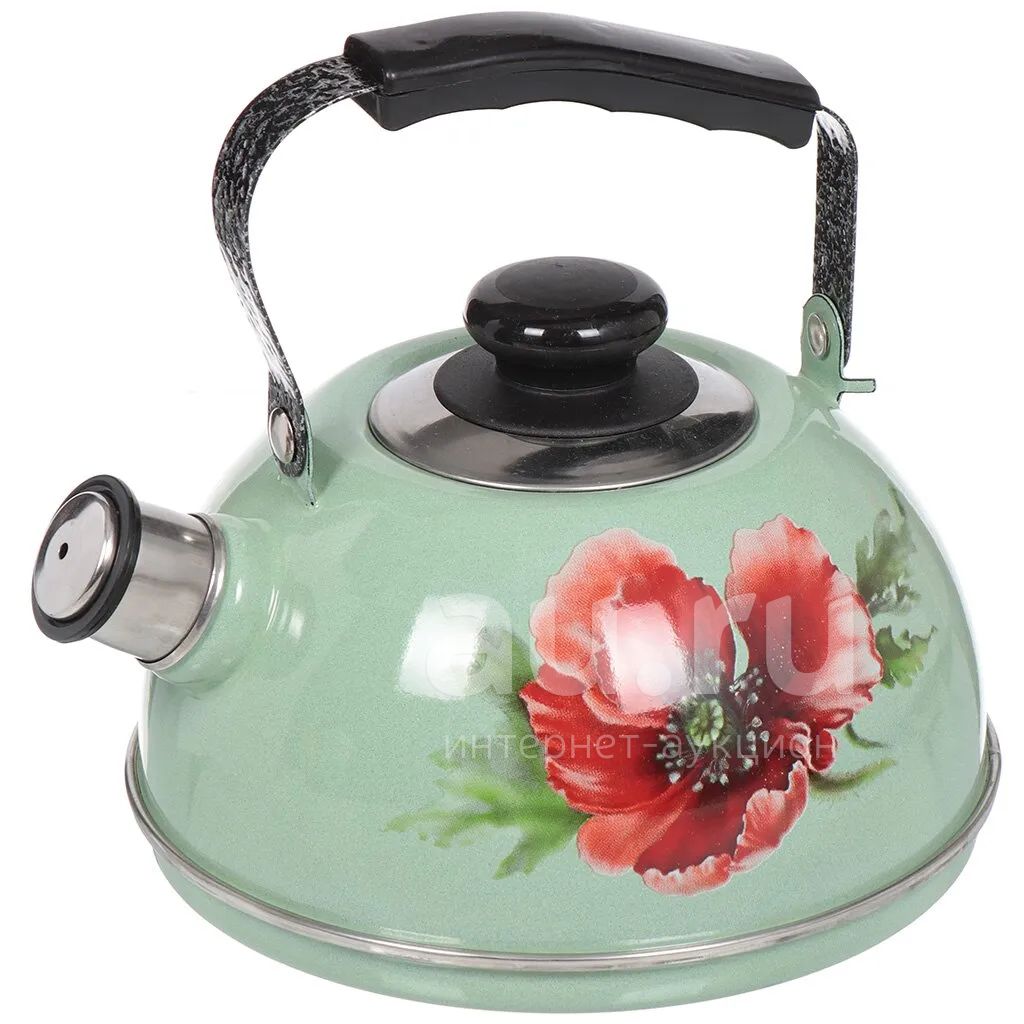 Чайник сталь, эмалированное покрытие, 2.5 л, со свистком, декор, подвижная ручка, Рубин, Селадон, TM04/25/10/04