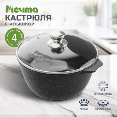 90руб.Кастрюля алюминий, антипригарное покрытие, 10 л, крышка стекло, Мечта, Гранит, 410701