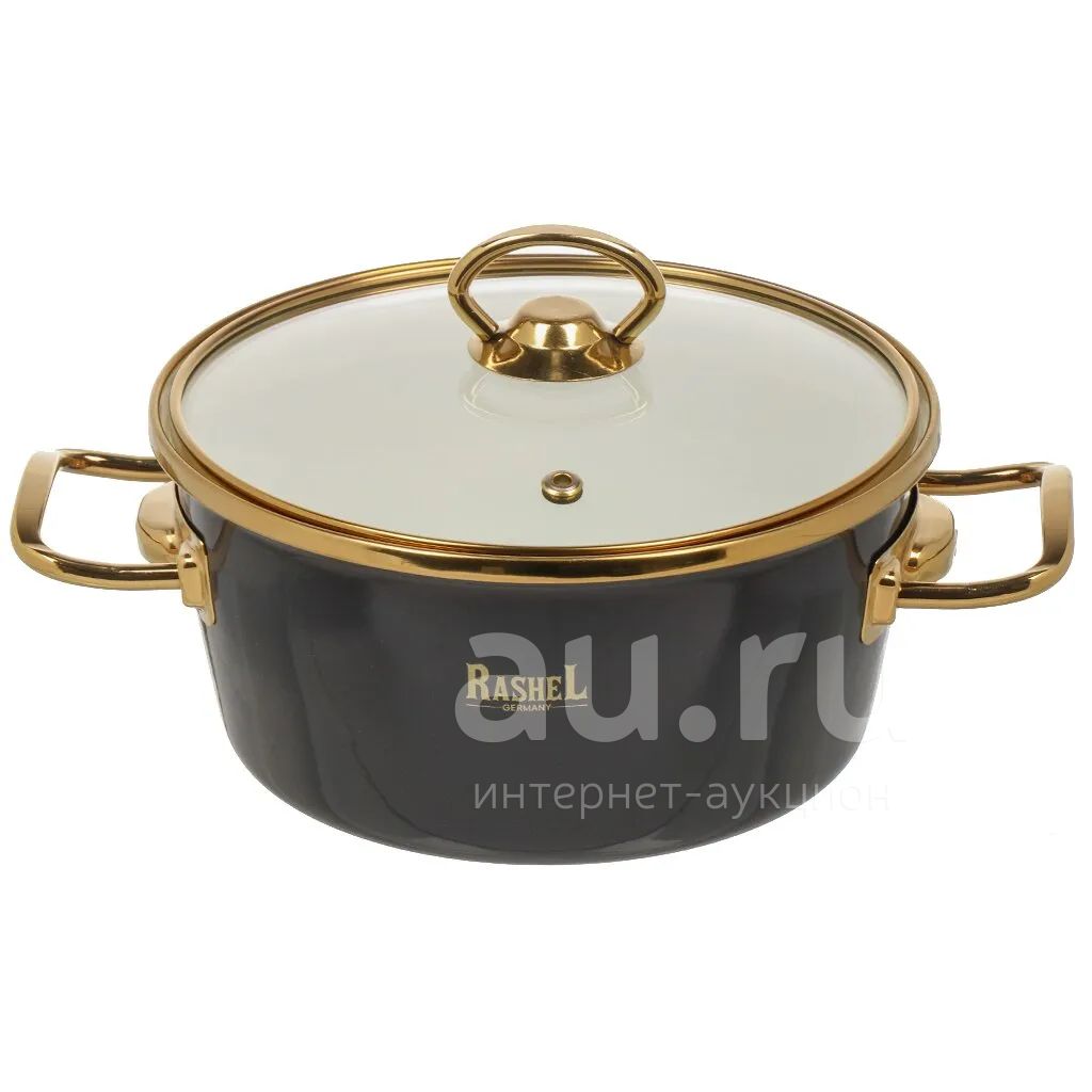 Кастрюля эмалированная сталь, 2.1 л, с крышкой, крышка стекло, ручки золото, круглая, RasheL, Grand, R0818, графит, индукция