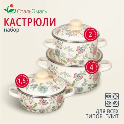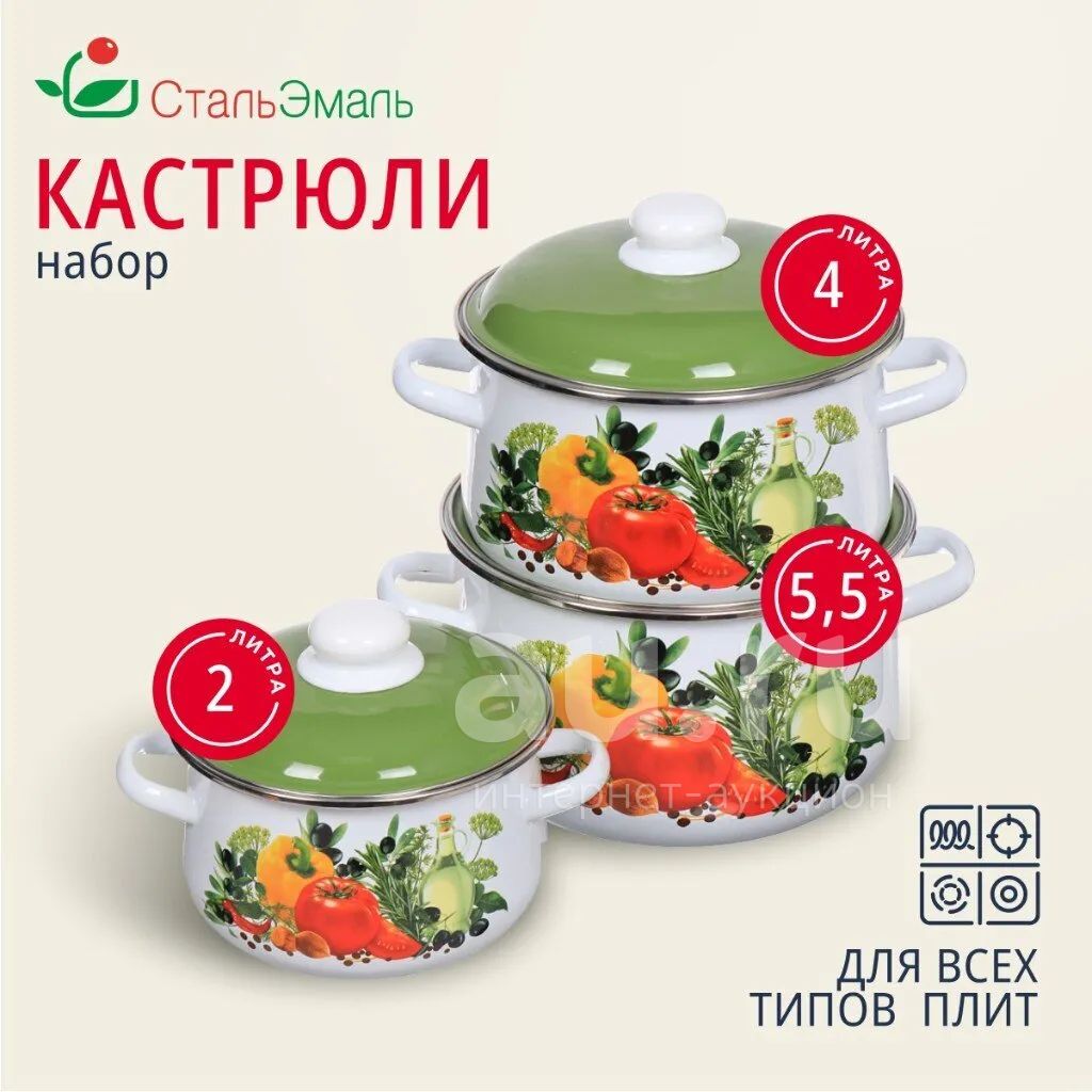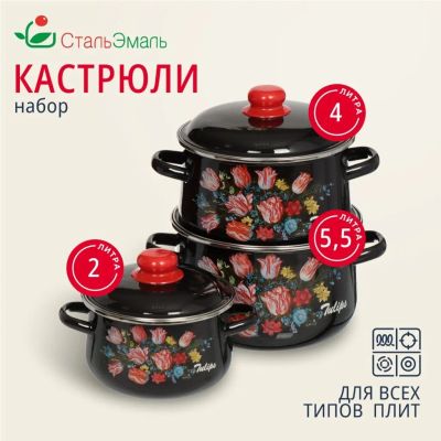 Набор посуды эмалированная сталь, 6 предметов, кастрюли 2,4,5.5 л, индукция, СтальЭмаль, Европейская кухня, 1с408