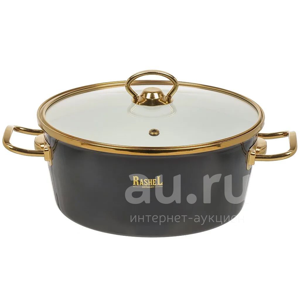 Кастрюля эмалированная сталь, 3.5 л, с крышкой, крышка стекло, ручки золото, круглая, RasheL, Grand, R0822, графит, индукция
