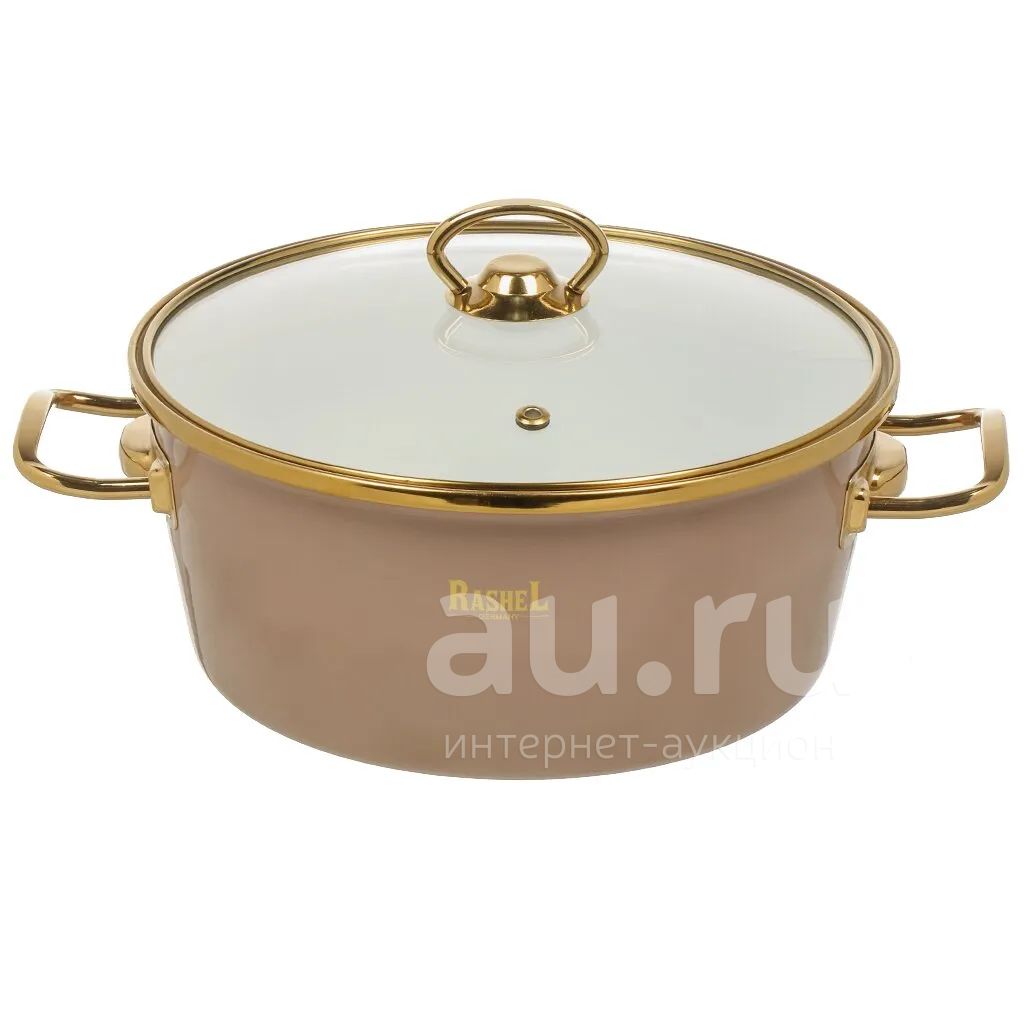 Кастрюля эмалированная сталь, 3.5 л, с крышкой, крышка стекло, ручки золото, RasheL, Grand, R0222, кремово-розовая, индукция