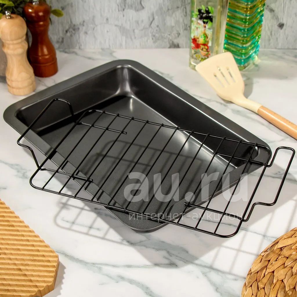 Противень для запекания, снабженный решеткой для стекания жира и сока. Позволяет получить эффект гриля в домашних условиях. Прилагаемая решетка поднимает ингредиенты, обеспечивая быстрое, равномерное и низкожировое приготовление, поскольку пища не готовится в собственном жире. Антипригарное покрытие для удобного извлечения пищи и легкой чистки, не содержит ни свинца, ни кадмия. Используйте только деревянные, силиконовые или пластиковые лопатки.