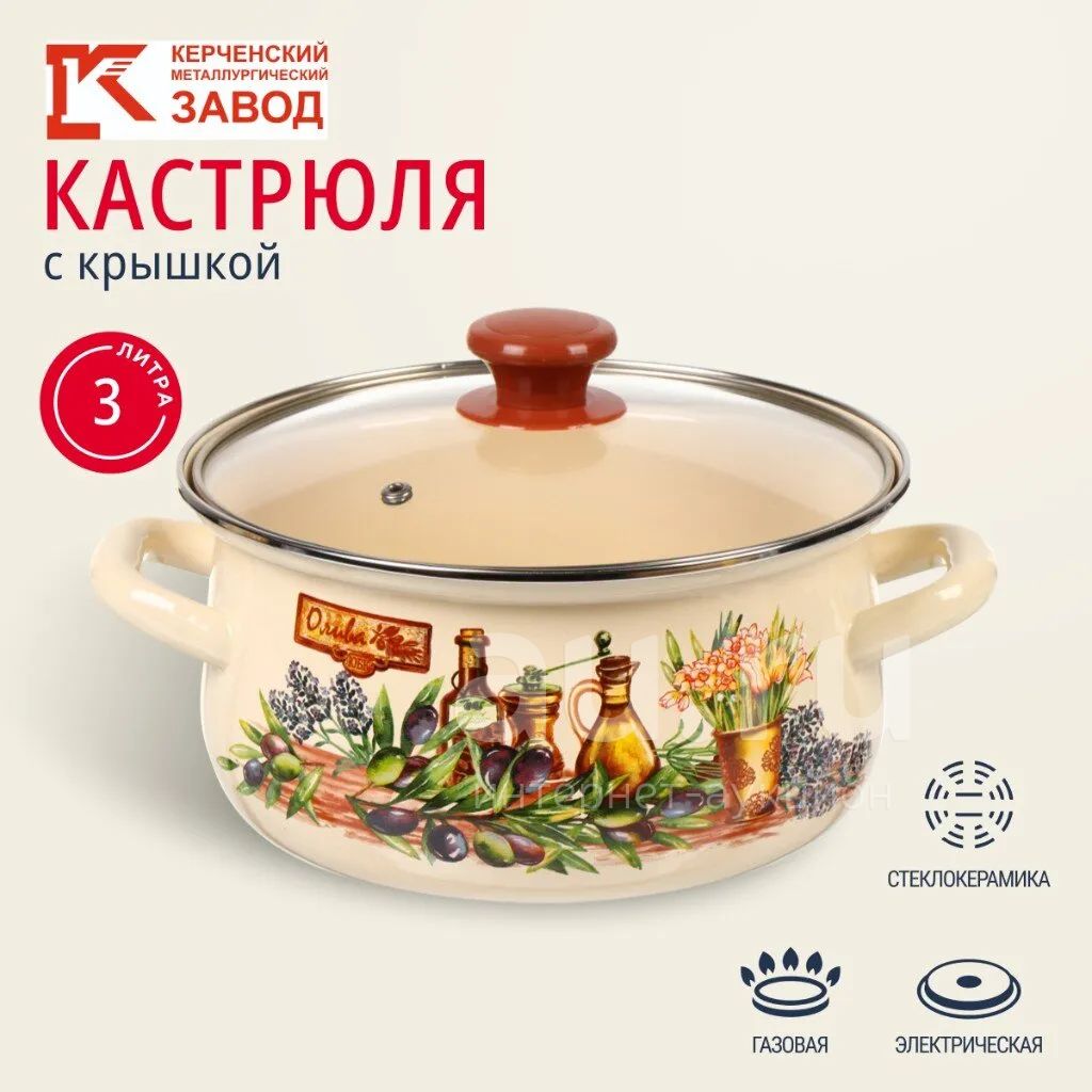 Кастрюля эмалированная сталь, 3 л, с крышкой, крышка стекло, с декором, сферический, Керченский металлургический завод, Италика, 61904-122/4.02-У4
