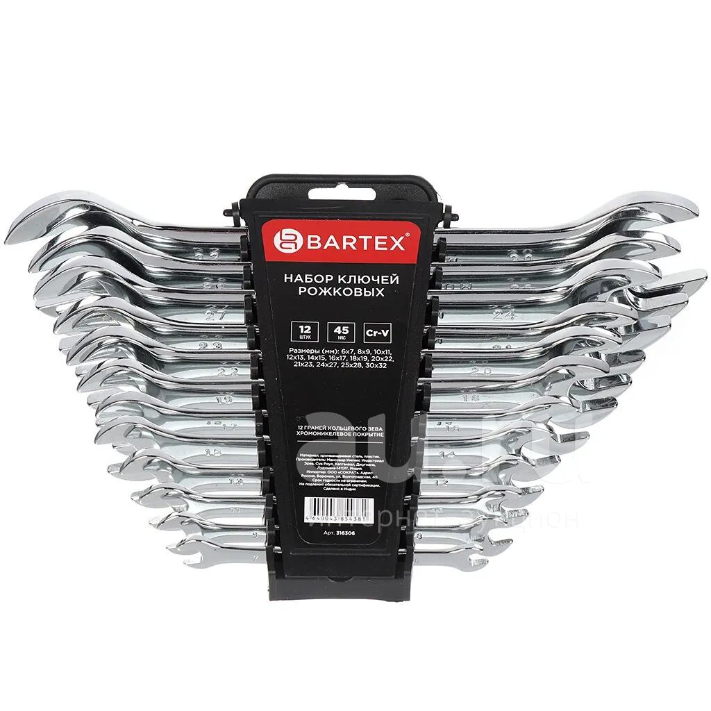 Набор ключей рожковый, 12 предметов, Bartex, 6-32 мм, хромированный зеркальный, CrV сталь, держатель