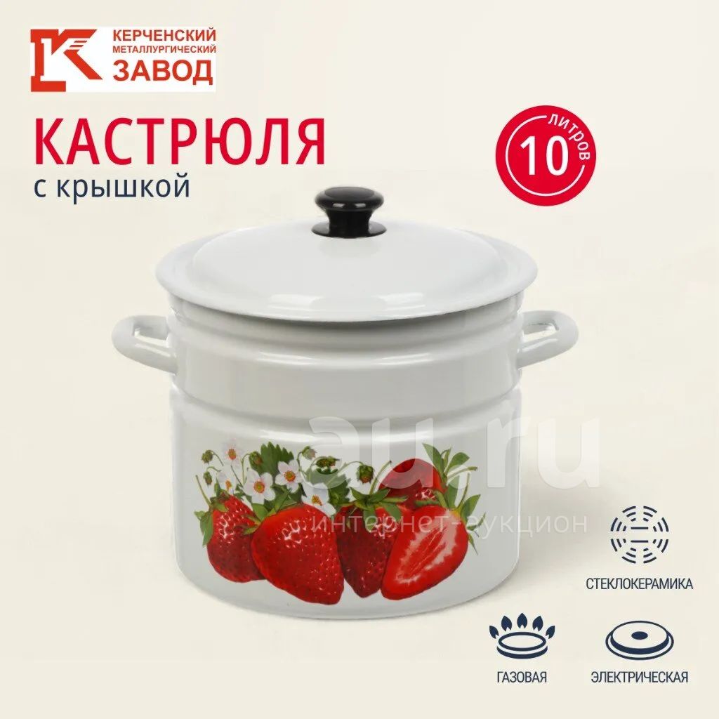 Кастрюля эмалированная сталь, 10 л, крышка сталь, цилиндрическая, Керченский металлургический завод, Садовая клубника, 41804-222/6-У2, белая