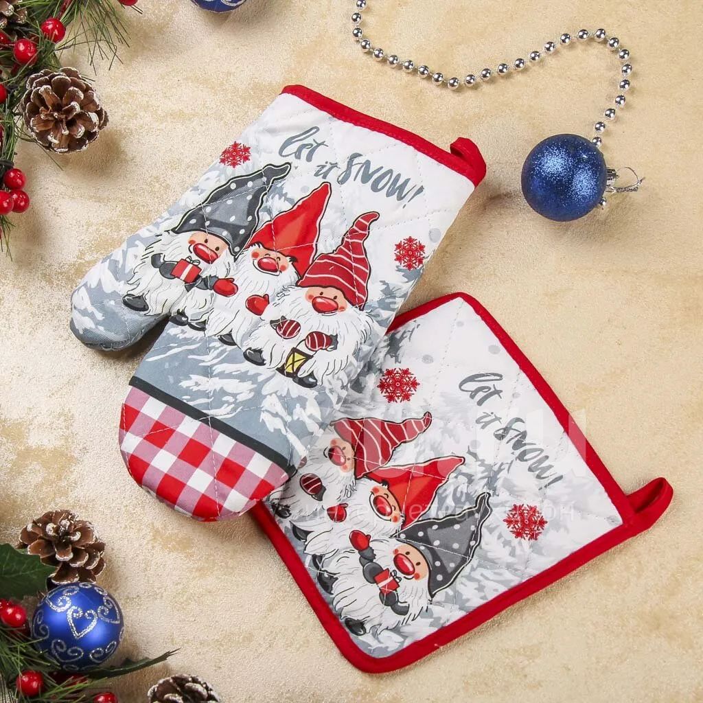 Набор кухонный 2 шт, 26х18см + 18х18 см (варежка, прихватка), 100% хлопок, Новогодние гномы, бело-серый