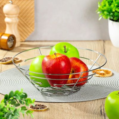 Современный дизайн фруктовницы, изготовленной из хромированной стали, идеально впишется в интерьер современной кухни. Выполнена в виде чаши, стенки которой состоят из металлических прутков. Фруктовница имеет ножки с металлическими шариками - для устойчивости.