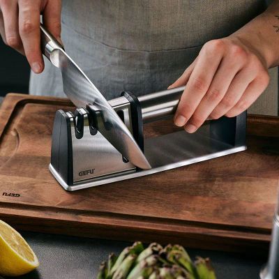 Даже самая крепкая сталь нуждается в заточке, ведь со временем режущая кромка изнашивается, на ней появляются микротрещины и зазубрины. Сгладить проявившиеся недостатки возможно только при помощи специальных устройств. Помочь сможет точилка для ножей, которая исправит остроту и шероховатость лезвия. Материал: пластик.