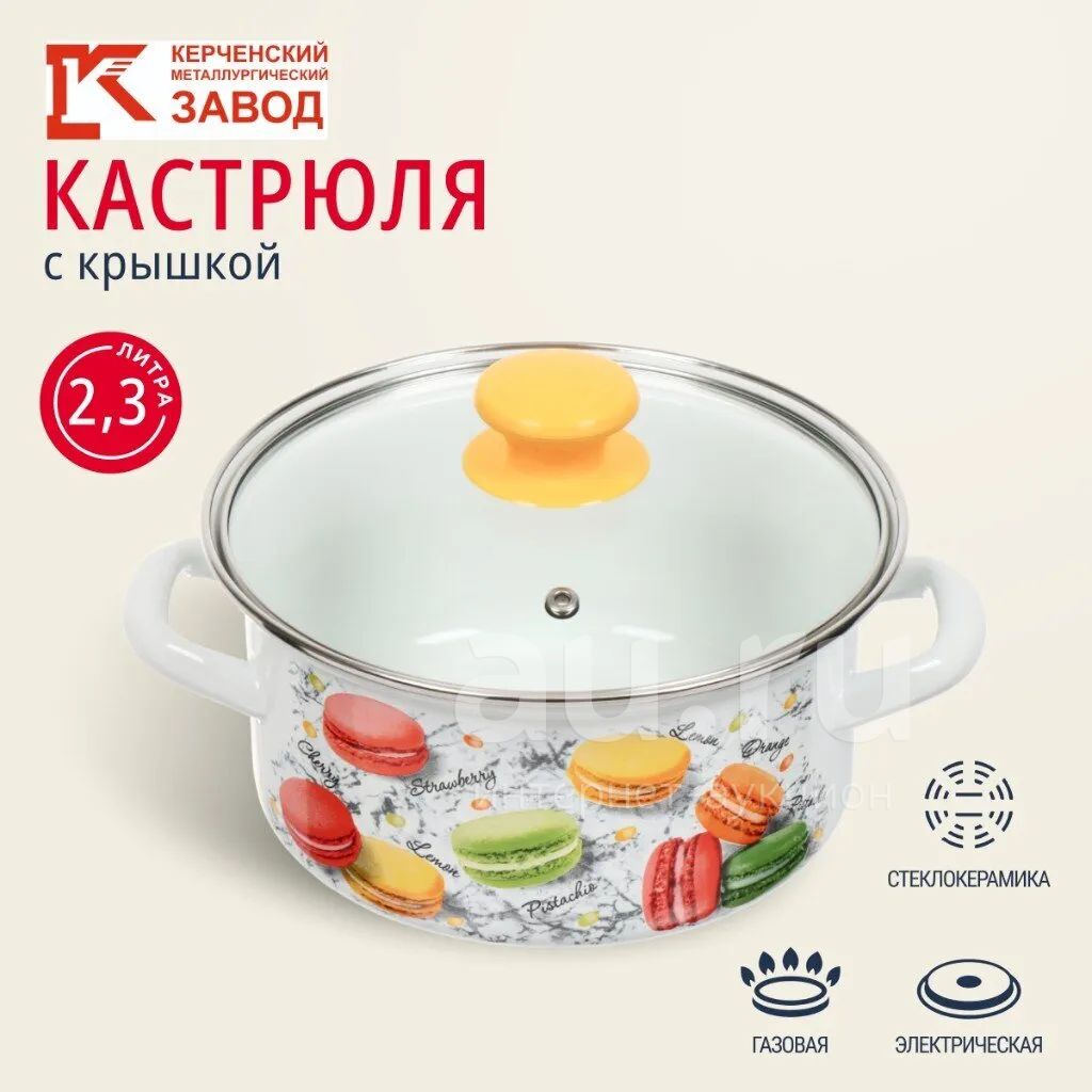 Эмалированная кастрюля 2,3 л с крышкой из стекла — надежный выбор для дома и дачи: долговечная, безопасная, стильный дизайн «Цветное печенье», подходит для ежедневного использования.