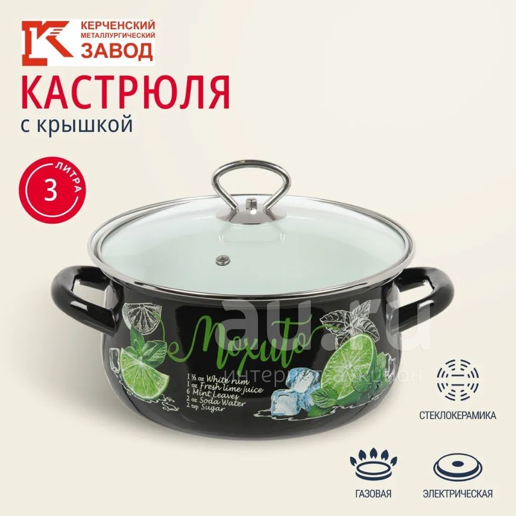 Кастрюля эмалированная сталь, 3 л, крышка стекло, с декором, сферический, Керченский металлургический завод, Мохито, 61915-123/4