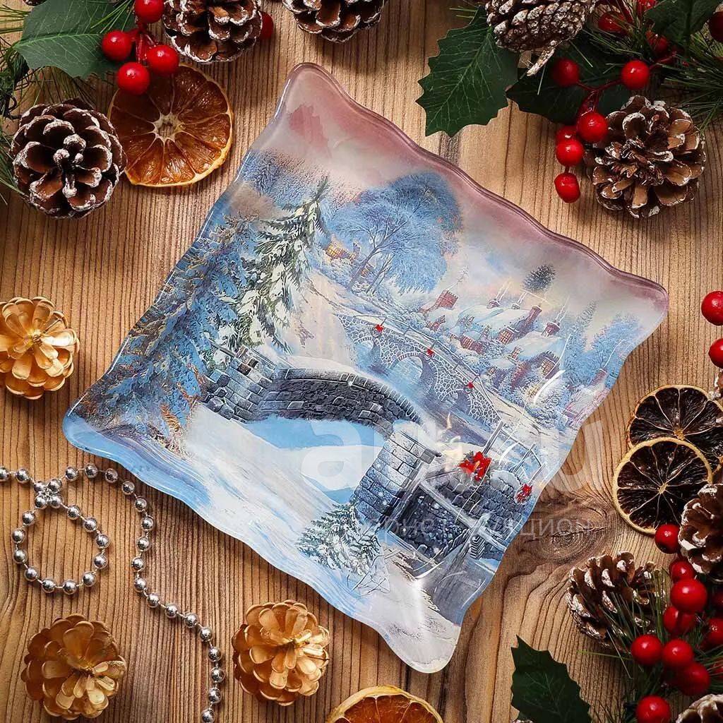 Тарелка десертная, стекло, 20х20 см, рифленая, квадратная, Зимний вечер, Daniks