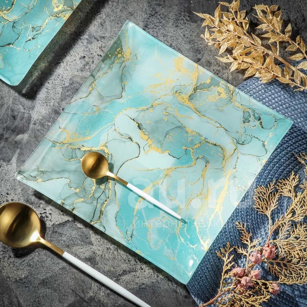 Тарелка обеденная Daniks Флюид 23х23 см: стильная бирюзовая квадратная посуда из стекла для сервировки дома и дачи — безопасно для СВЧ и посудомойки.
