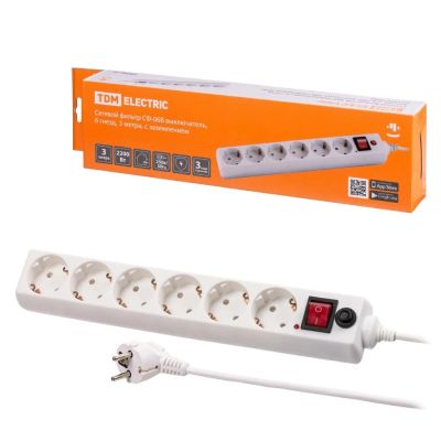 Сетевой фильтр 6 гнезд, 3 м, с заземлением, 16 А, 250 В, TDM Electric, СФ-06В, SQ1304-0012