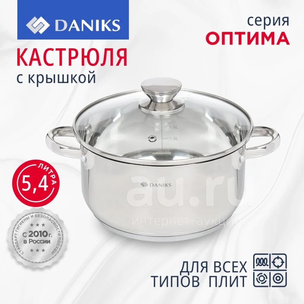 Кастрюля Daniks Оптима 5.4 л из нержавеющей стали с капсульным дном: готовьте больше любимых блюд на любой плите — удобно, быстро, выгодно для семьи и дачи.