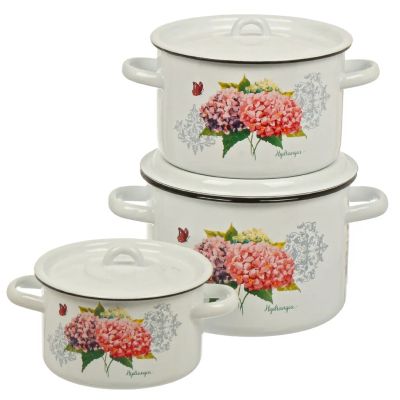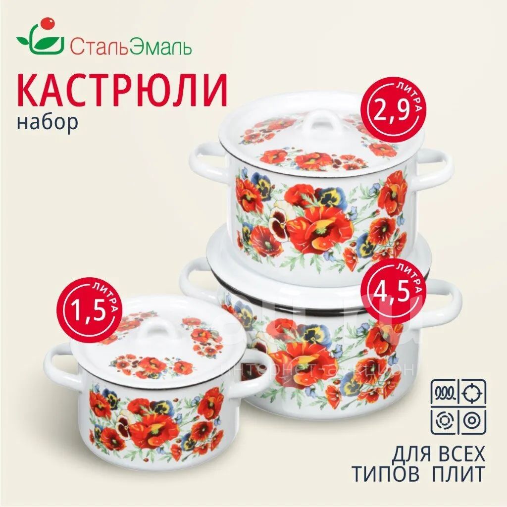 Набор посуды эмалированная сталь, 3 предмета, кастрюли 1.5,2.9,4.5 л, индукция, СтальЭмаль, Маки мечта, 1с33