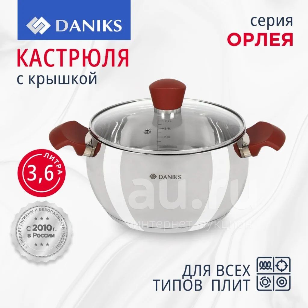 Кастрюля Daniks Орлея 3,6 л из нержавеющей стали с мерной шкалой и стеклянной крышкой: оптимальный выбор для индукционных и любых плит, выгодная цена для дома и дачи.