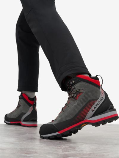 Ботинки от Kayland — оптимальный выбор экипировки для длительных горных переходов и треккинга. Мембрана GORE-TEX® надежно защищает ноги от промокания и поддерживает комфортный микроклимат внутри обуви в самых трудных условиях. Подметка Vibram® гарантирует оптимальное сцепление на неровных поверхностях. Предусмотрена возможность закрепить на обуви кошки при движении по самым сложным участкам маршрута. На задней части ботинка есть текстильная петля, с помощью которой вы сможете быстрее переобуваться. Мягкая манжета на голенище не сковывает движения и помогает сделать каждый шаг более комфортным. Прочный широкий бампер из резины защитит стопу от травм при случайных ударах об острые камни и продлит срок службы изделия. Нижнюю и верхнюю часть ботинок можно фиксировать независимо друг от друга благодаря двухсекционной шнуровке. Металлические петли позволяют регулировать силу натяжения шнурков и точно подстраивать посадку под себя. Модель изготовлена из устойчивых к повреждениям материалов и выдерживает даже самые серьезные нагрузки во время походов по пересеченной местности. Система поддержки голеностопа Ankle Lock System фиксирует лодыжку, предотвращая возникновение травм и не сковывая при этом движения.