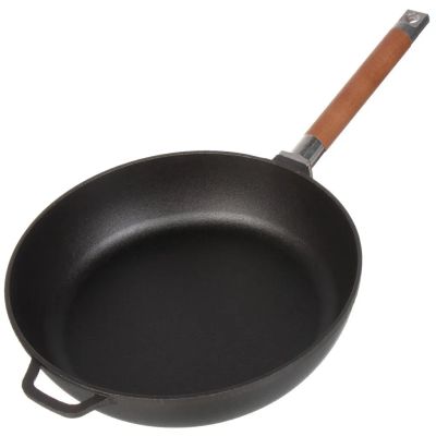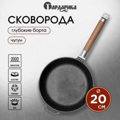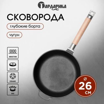 Чугунная сковорода Гардарика 24 см с высокой стенкой и съемной деревянной ручкой — идеальный выбор для здорового и вкусного приготовления на любой плите, включая индукцию.