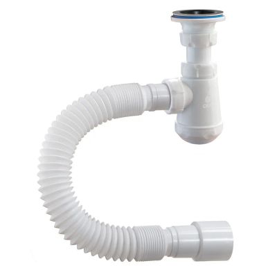 Бутылочный сифон выглядит как бутылка с горизонтальным ответвлением. Для подключения этой конструкции необходимо немного свободного пространства. Вода, которая находится в колбе, предупреждает проникновение канализационных запахов в помещение.