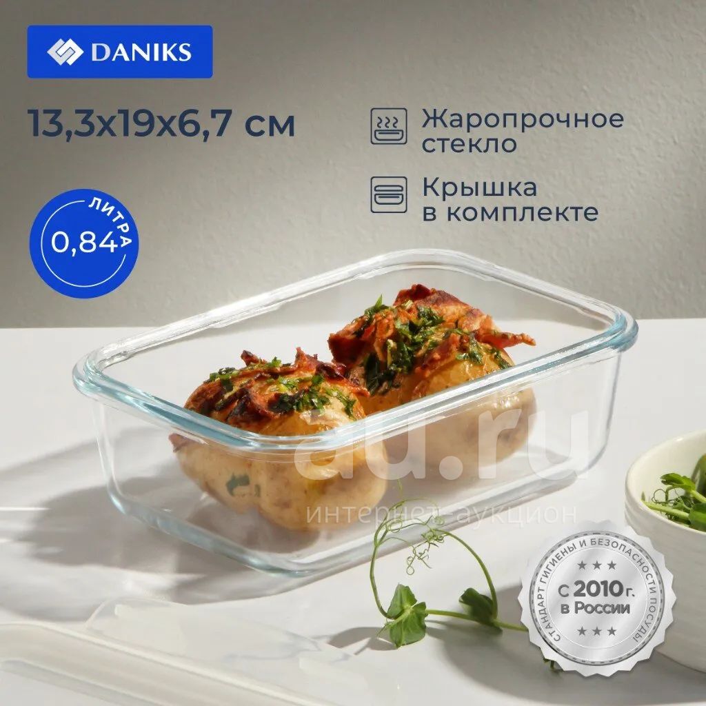 Форма для запекания стекло, 13.3х19х6.7 см, 0.84 л, прямоугольная, с крышкой, Daniks