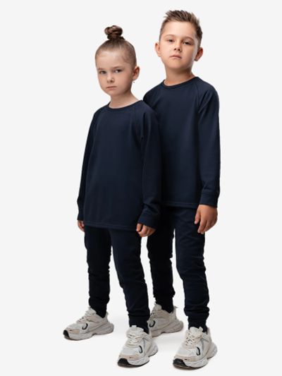 Детский термокостюм. Свитшот: рукава на манжетах, полуприлегающий покрой. Брюки: прилегающий покрой; пояс — эластичная резинка; зауженный низ; без застежек; без карманов. Термобифлекс (100% полиэстер).