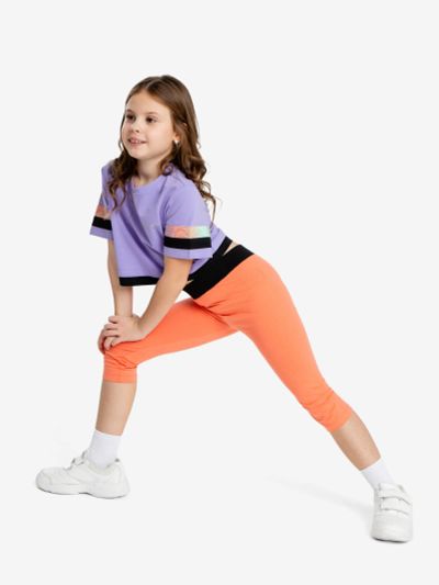 Укороченные велосипедки. Фиолетовая модель с контрастным ярким поясом на резинке станет отличным выбором для активных девчонок, так как пояс отлично тянется и не сковывает движения. Выполненные из 60% хлопка, 35% полиэстера и 5% эластана, велосипедки очень прочные, отлично впитывают влагу, приятные на ощупь, обеспечивают оптимальное дыхание для кожи. Они не только стильные, но и практичные: легко стираются и сохраняют свой первоначальный вид даже после многократных стирок. Линейка Active создана для энергичных и активных, поэтому велосипедки станут отличным спутником на занятиях спортом.