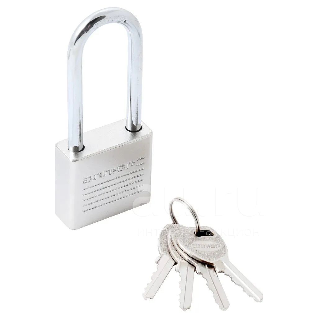Замок навесной Аллюр, ВС1Ч-038Д, 16834, блистер, цилиндровый, с удлиненной дужкой, хром, 38 мм, 4 ключа