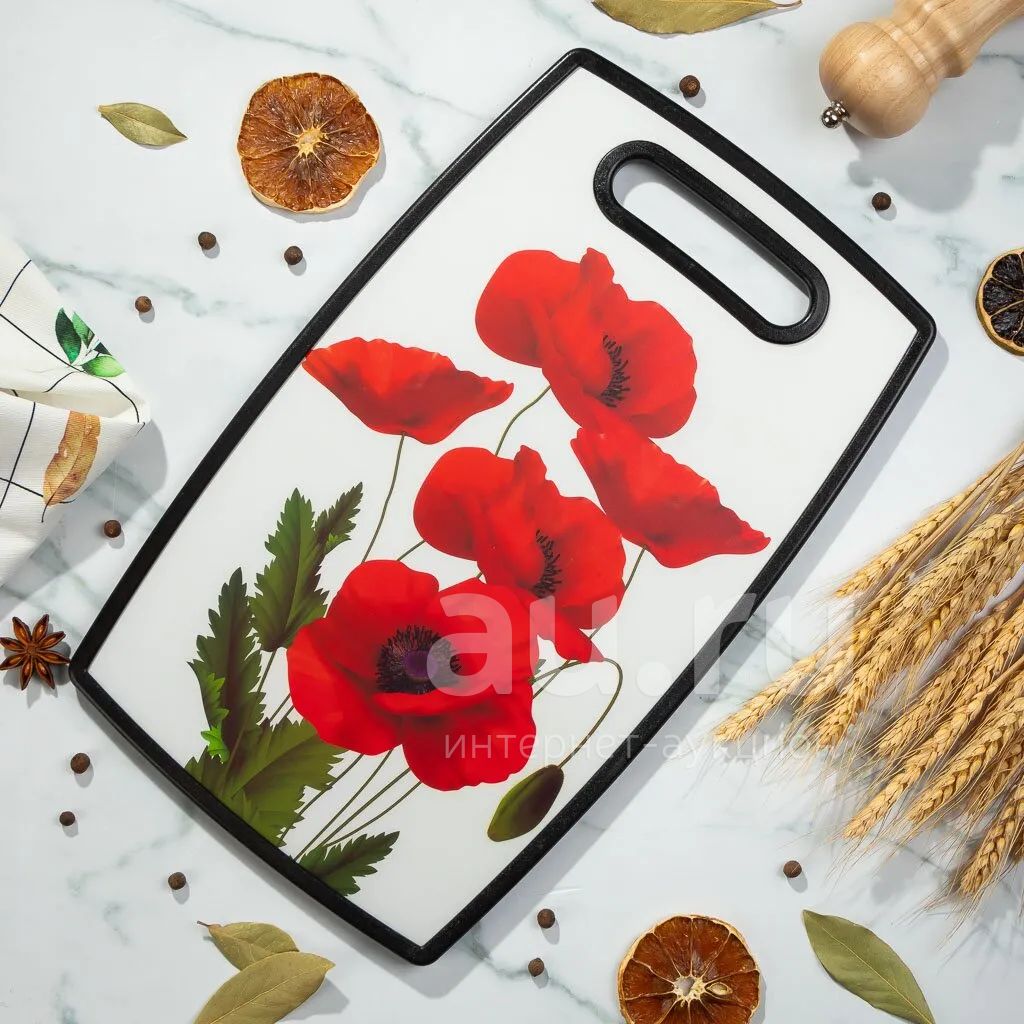Доска разделочная пластик, 37х23 см, с ручкой, прямоугольная, Маки, Y4-7880