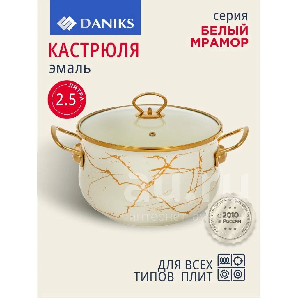 Кастрюля Daniks «Белый мрамор», 2.5 л: стильная эмалированная сталь для индукции и любых плит. Решение для здорового питания без лишних хлопот.