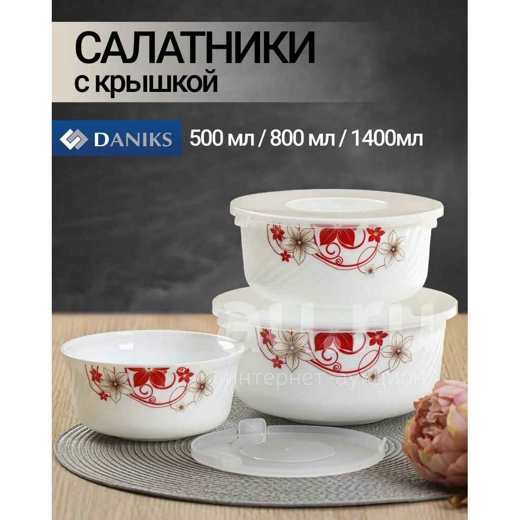 Салатник стеклокерамика, круглый, 3 шт, 9 см, 19, 16, 14 см, 0.5, 0.8, 1.4 л, с крышкой, Кармен, Daniks, BY14HDW-3-T36 DANIKS