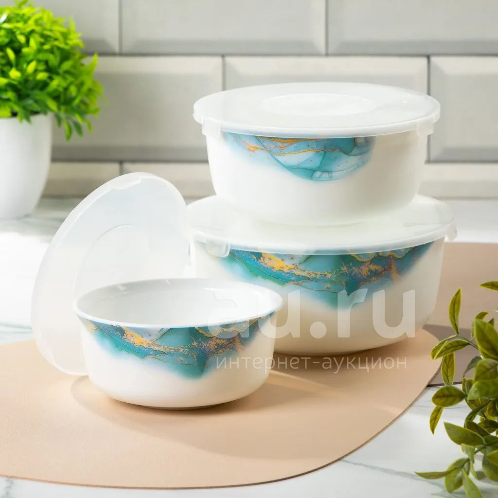 Салатники Daniks Флюид с крышками: стеклокерамика, 3 размера (0.5/0.8/1.4 л), синий — универсальный набор для сервировки и хранения без лишних хлопот.
