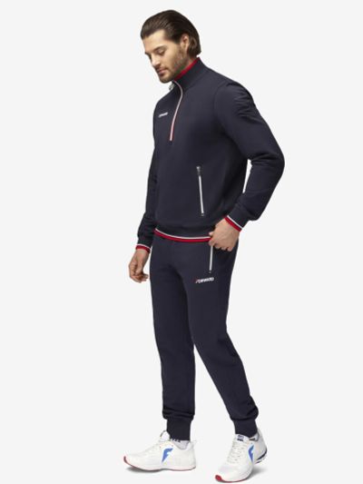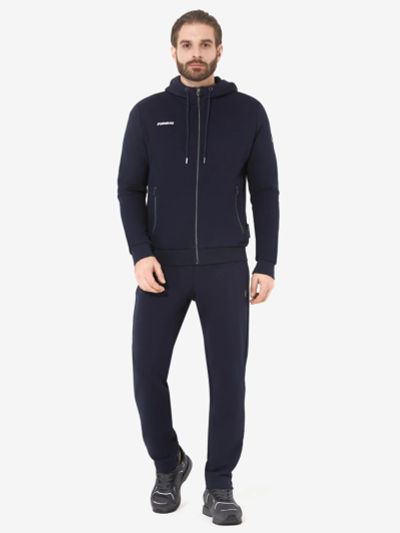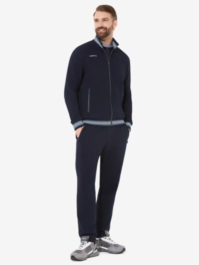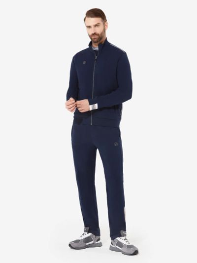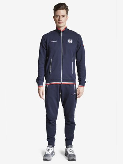 Костюм из трикотажного полотна. Куртка прямого силуэта. Воротник-стойка. Центральная застежка-молния. Карманы накладные, с клапанами, застегиваются на кнопки. Рукава втачные, с чуть спущенными плечами. Манжеты рукавов, воротник и пояс по низу изделия выполнены из трикотажного полотна ластик. Нанесения на куртке: текстильный шеврон. Брюки зауженного книзу силуэта. Боковые карманы обработаны тесьмой-молнией. Пояс с эластичной тесьмой. Ширина пояса регулируется шнуром, вставленным внутрь. По низу брюк выполнены манжеты из трикотажного полотна ластик. Нанесения на брюках: вышивка F. 55% хлопок, 45% полиэстер.