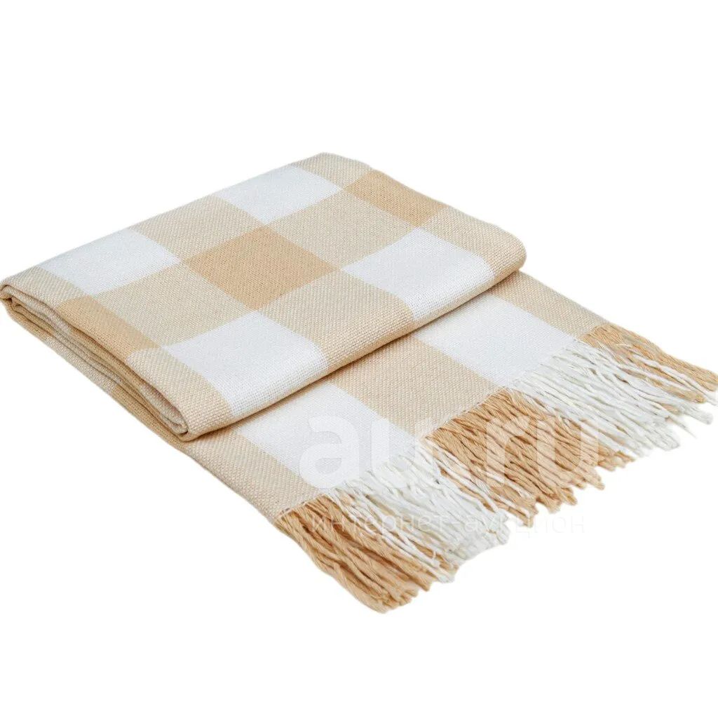 Плед 1.5-спальный, 140х200 см, хлопок, полиэстер, Vladi, Пикник, белый, бежевый, бежевая клетка, 50079