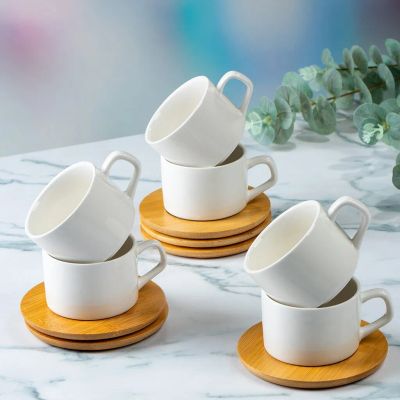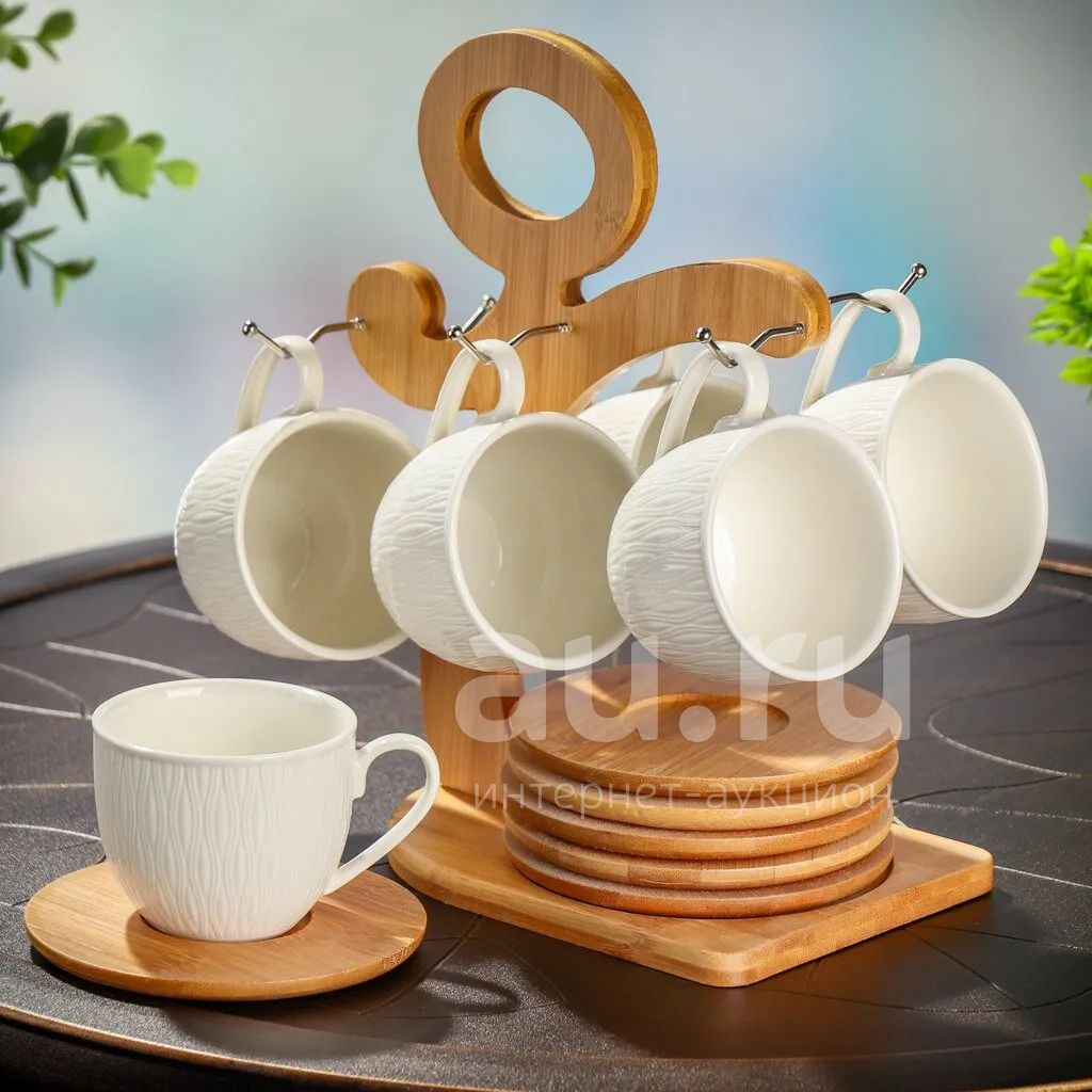 Набор чайный керамика, 12 предметов, на 6 персон, 170 мл, бамбуковая подставка, белый, Белый, Y4-6602, подарочная упаковка