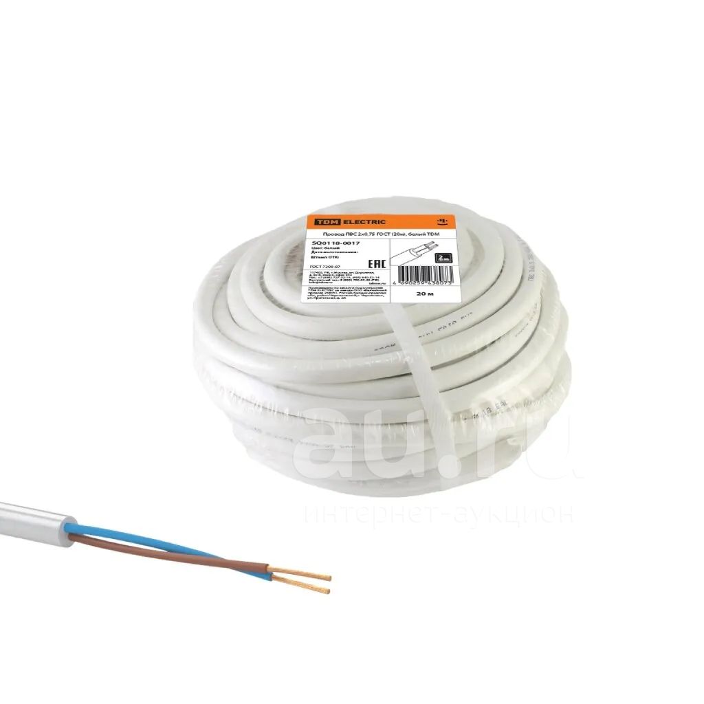 Провод ПВС, 2х0.75 мм², 20 м, медь, гибкий, ГОСТ, белый, TDM Electric, SQ0118-0017