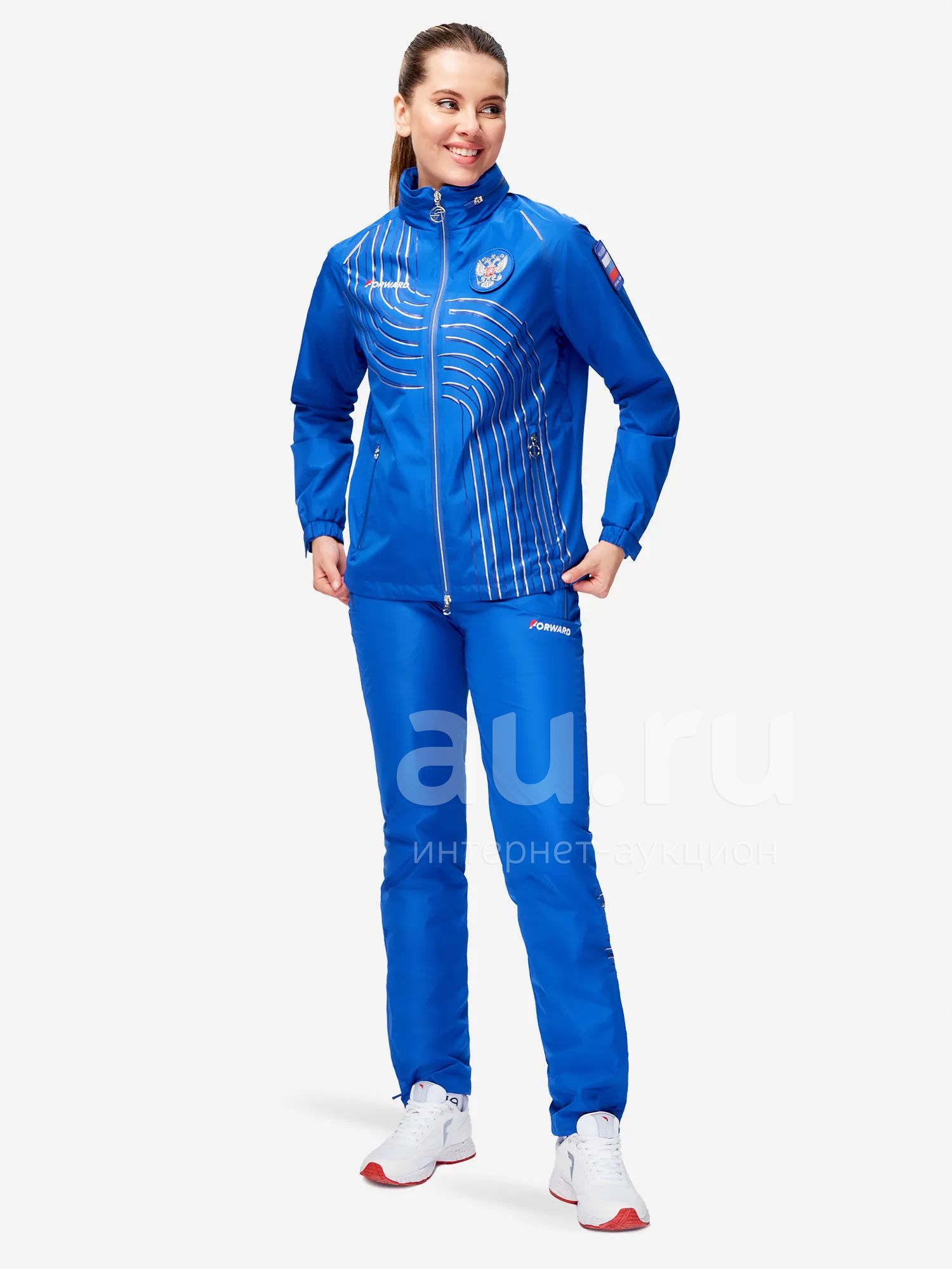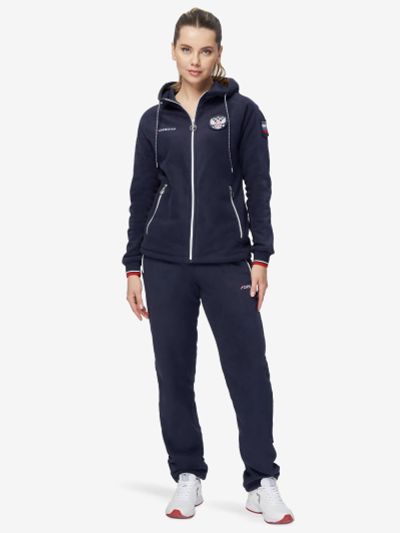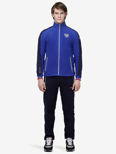 Куртка прямого силуэта на подкладке. Воротник-стойка с карманом для капюшона на молнии. Полочка с центральной застежкой-молнией. Боковые карманы прорезные, с застежкой-молнией. Рукава реглан с отрезными манжетами на эластичной тесьме, с патами. Куртка с вентиляцией в области проймы на молнии. В швах проймы — светоотражающие элементы. Низ изделия с эластичным шнуром и фиксаторами. Нанесения на куртке: жаккардовый шеврон "Герб РФ", жаккардовый шеврон "Флаг РФ, RUSSIAN NATIONAL TEAM", вышивка "FORWARD", 3D-вышивка F, принт "Трек", принт "Мы вместе. Спорт". Брюки слегка заужены. Боковые карманы прорезные, на молнии. На задних половинках брюк, под коленями — светоотражающие элементы. Пояс с эластичной тесьмой. Ширина пояса регулируется шнуром, вложенным внутрь. В боковых швах, по низу брюк выполнены разрезы с тесьмой-молнией, шнуром и фиксаторами. Нанесения на брюках: вышивка FORWARD, принт "Мы вместе. Спорт", принт "Трек". Ткань верха: 100% полиэстер; материал подкладки: сетка (100% полиэстер).
