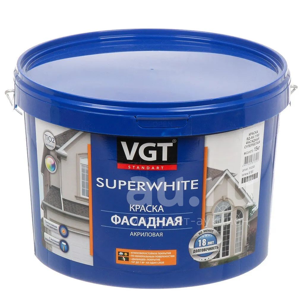 Краска водно-дисперсионная, VGT, акриловая, фасадная, влагостойкая, матовая, супербелая, 15 кг