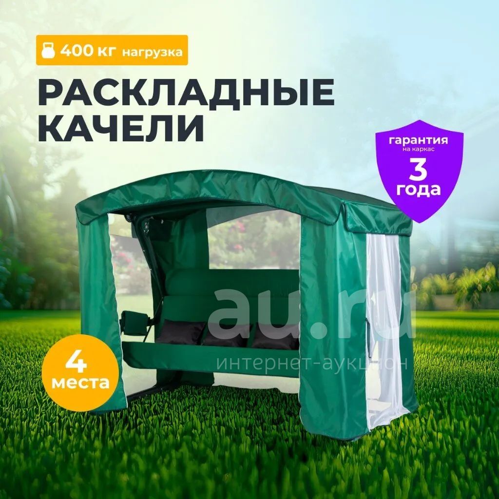 Качели садовые 4-местные, 252х150х185 см, 400 кг, Флорис, раскладываются в кровать, с москитной сеткой, зеленые, подушка, металл