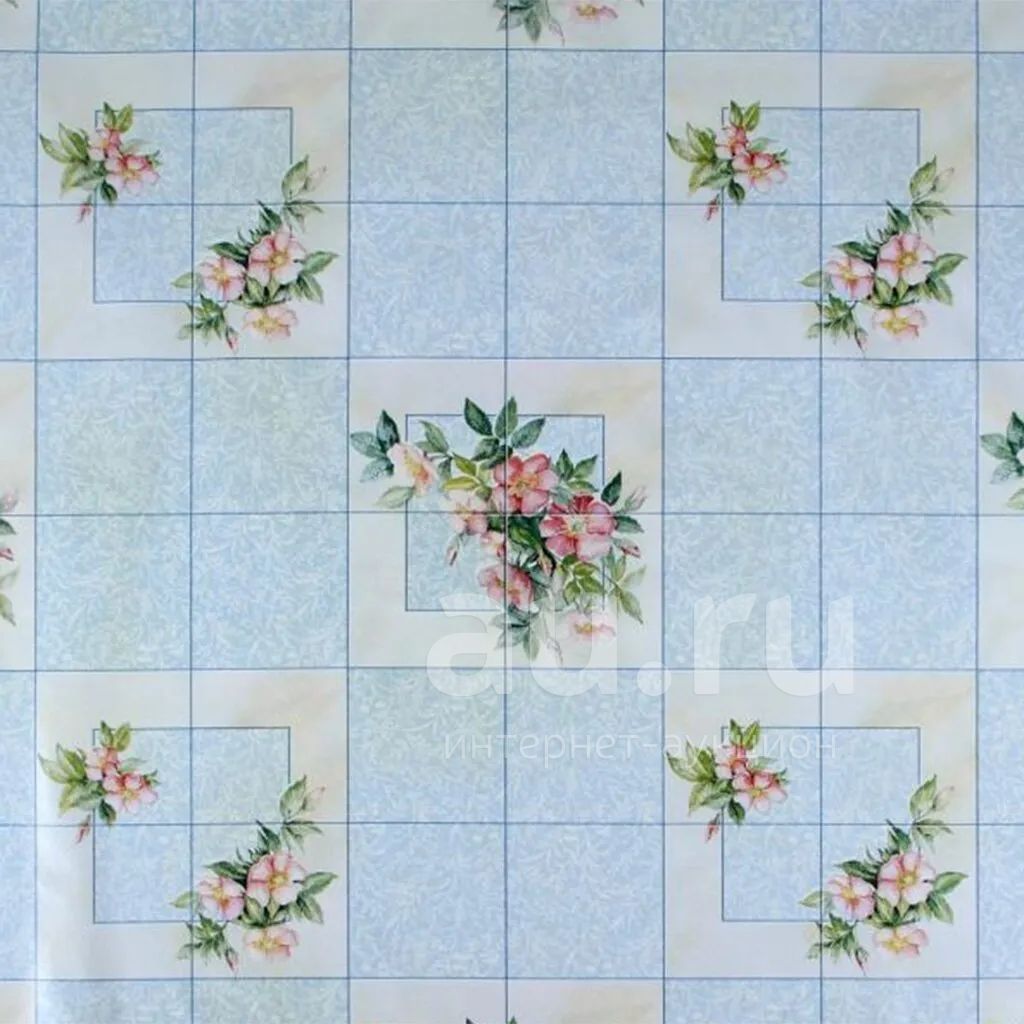 Клеенка Колорит, Ткань, 1.3х25 м, ПВХ на тканевой основе, голубая, Цветы на клетке голубой фон, 710-1