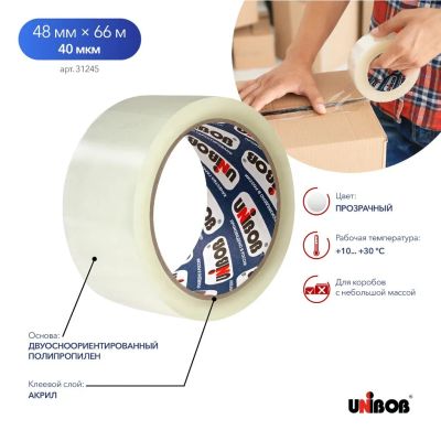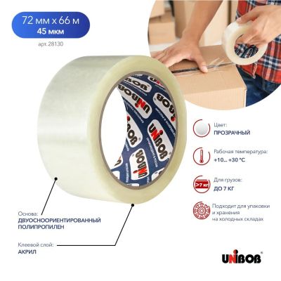 Клейкая лента упаковочная, 72 мм, прозрачная, основа полипропиленовая, 66 м, 45 мкм, Unibob, 600, 74778
