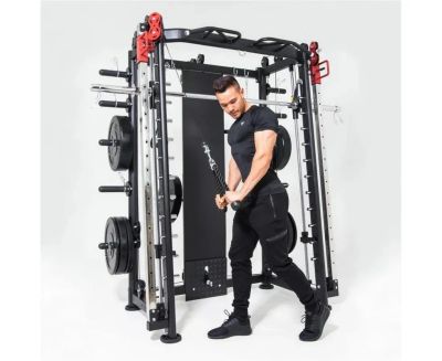 основная информация машина смита dfc maxxus gsmx-600019 — полноценная замена спортзалу у вас дома! она сочетает в себе машину смита, силовую станцию, мультипозиционный турник и функциональную раму, позволяя прорабатывать все группы мышц в одном комплексе. максимальная нагрузка на штангу — 250 кг, на тягу сверху/снизу — до 250 кг, баттерфляй — до 120 кг, при этом стальные тросы с нейлоновой оболочкой выдерживают нагрузку до 1000 кг. максимальный вес дисков устанавливаемых на подвижную каретку - 180 кг. тренажер имеет 6 посадочных мест для дисков диаметром 50 мм. в комплекте идут пружинные зажимы для дисков. к функциям силовой станции относятся: машина смита приседания жим лёжа гребля подтягивания баттерфляй тренировка с утяжелителями т-образная тяга нижняя тяга лэндмайн тренировка пресса вы можете выполнять десятки упражнений: от классических жимов штанги, становой тяги и приседаний, до тяги в наклоне, тяги к поясу, разводки рук на грудные мышцы, скручиваний на пресс, подтягиваний и гребли. это делает тренажер идеальным решением для фулбади тренировок дома. каркас мультистанции изготовлен из высокопрочной стали (профиль 50 х 100 х 2 мм и 50 х 70 х 1,5 мм), что обеспечивает долговечность и устойчивость конструкции даже при максимальных нагрузках. прочная спинка 83,5 х 33 х 5,5 см обеспечивает комфорт во время выполнения упражнений. компактные габариты для своего класса (216,5 х 186 х 213,5 см) позволяют использовать мультистанцию даже в ограниченном пространстве. дополнительные характеристики страна производства китай количество посадочных мест 6 нагрузка на встроенный гриф 250 кг нагрузка тяга сверху / снизу до 250 кг посадочный диаметр дисков 50 мм профиль рамы 50 х 100 х 2 мм; 50 х 70 х 1,5 мм размер спинки 83,5 х 33 х 5,5 см нагрузка на баттерфляй 120 кг