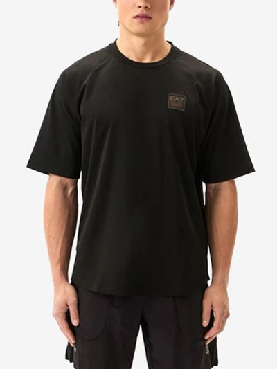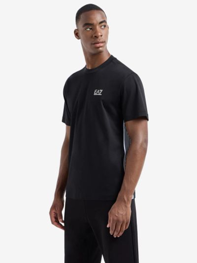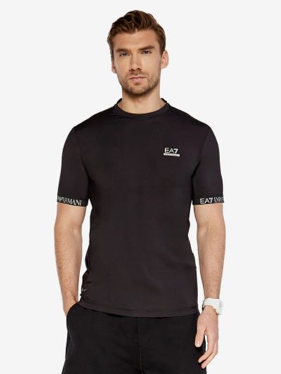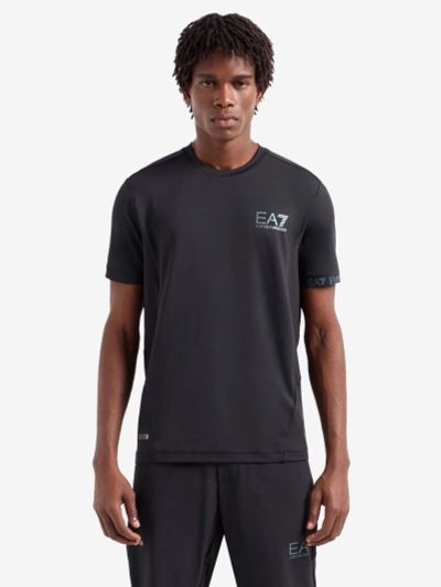 Футболка с круглым вырезом и эластичным трикотажем на воротнике и манжетах от EA7 Emporio Armani. Модель отличается жаккардовым принтом из монограмм бренда EA7, который образует геометрический узор, подчеркивающий смелый и оригинальный характер изделия. Свежая и универсальная вещь, состоящая из 100% хлопка и идеально подходящая для отдыха и занятий спортом.