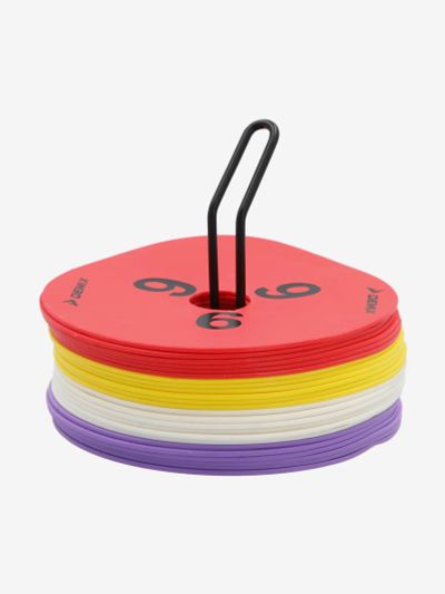 Противоскользящие плоские тренировочные маркеры разных цветов для помощи во время тренировок, ярко окрашены для хорошей видимости. Цвет: желтый, оранжевый неон. Изготовлен из качественного поливинилового материала, прочный, устойчив к царапинам, водостойкий, антискользящее покрытие, не повреждает пол и не оставляет следов при удалении. Размер: диаметр 19 см, толщина 2.5 мм. Комплект: 12 шт. маркеров, сумка для переноски.