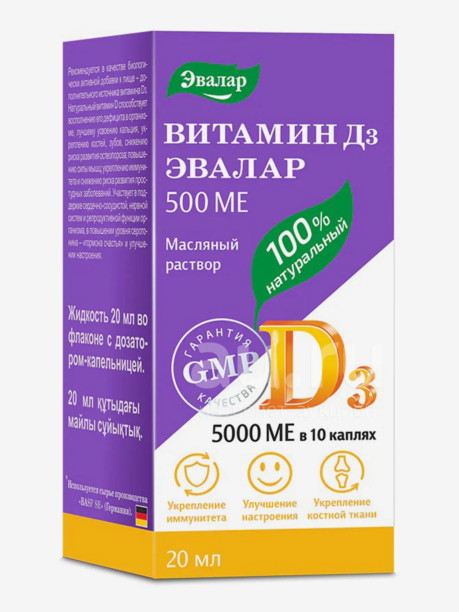 Натуральный витамин D3 500 МЕ в 1 капле: способствует восполнению его дефицита в организме, лучшему усвоению кальция, укреплению костей и зубов, снижению риска развития остеопороза; повышению силы мышц; укреплению иммунитета и снижению риска развития простудных заболеваний; участвует в поддержании сердечно-сосудистой, нервной систем и репродуктивной функции организма, в повышении уровня серотонина "гормона счастья" и улучшении настроения. Преимущества масляного раствора витамина D3: физиологичная для организма жирорастворимая форма витамина D3; удобное дозирование (флакон с дозатором-капельницей); экономный расход препарата (20 000 МЕ в 1 мл); высокое усвоение за счет масляной формы; нейтральный вкус и запах, хорошо воспринимается как детьми, так и взрослыми; не содержит аллергенных компонентов и спирта; сырье высокого качества. Способ применения: взрослым и детям с 3 лет принимать по 1 капле (500 МЕ) в день во время еды или согласно рекомендациям врача. Допускается добавлять в ложку с едой, на кусочек хлеба и т. д. Продолжительность приема 1–2 месяца. Противопоказания: индивидуальная непереносимость компонентов, беременность, кормление грудью. Перед применением рекомендуется проконсультироваться с врачом. БАД. Не является лекарственным средством.