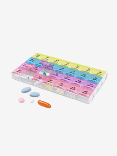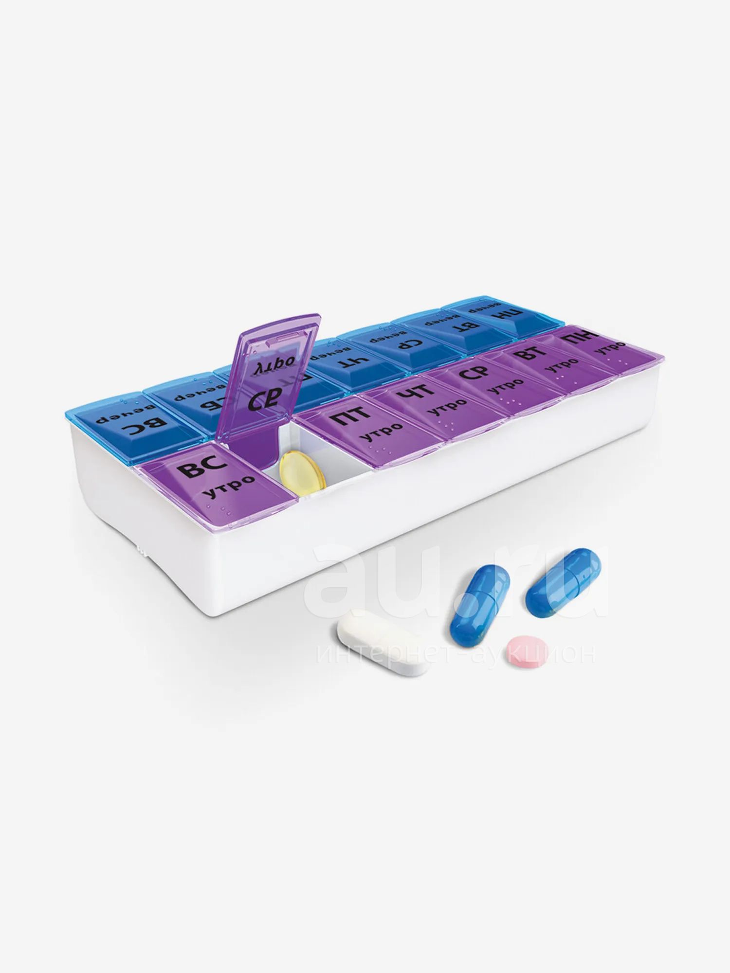 Таблетница представляет собой контейнер с 14 вместительными отделениями, промаркированными по дням недели и суточному режиму приема: утро, вечер. Для удобства крышки утренних и вечерних отсеков отличаются цветом. Маркировка выполнена крупным шрифтом на русском языке. Надписи долговечны, они не сотрутся от длительного и частого использования. Каждое отделение плотно закрывается крышкой, надежно предотвращая рассыпание содержимого. Таблетница поместится в сумку или рюкзак, ее можно брать с собой на работу или в дорогу. Перед первым использованием рекомендуется промыть контейнер теплой водой с мылом и тщательно высушить.